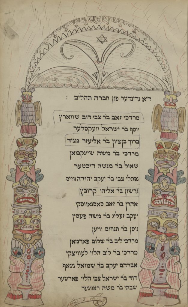 There may be no better example of an American pinkas than this one. On one of the interior pages, totem poles stand in for the traditional columns!